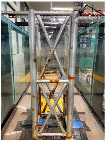 The scaled down testing model in the water tank for the offshore jacket-type structure.