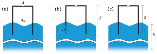 The schematic drawings for the side view of the OWC converter installed in an offshore template structure are shown in Figure 6a–c, where parameters such as the ratio of orifice area RA, the ratio of chamber height RZ, and the ratio of the front gate opening RO are correspondingly presented.