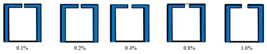 As mentioned in the relevant paper containing the analytical study’s analysis, the area ratio of the orifice cross-section of the OWC will have an influence on the performance of an OWC converting system. In order to compare the experimental data with the results of the numerical analysis, a set of the same dimensionless ratios of area between the OWC orifice cross-section and the area of the water surface were also installed in the chamber of the model structure, as was indicated by RA and listed in Table 2. Similarly, the ratio RA is ranged from 0.1% to 1.6%, as was shown in Figure 7.