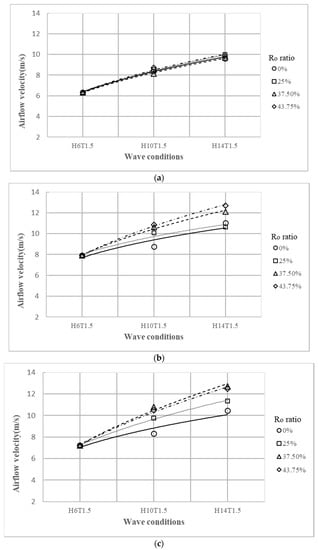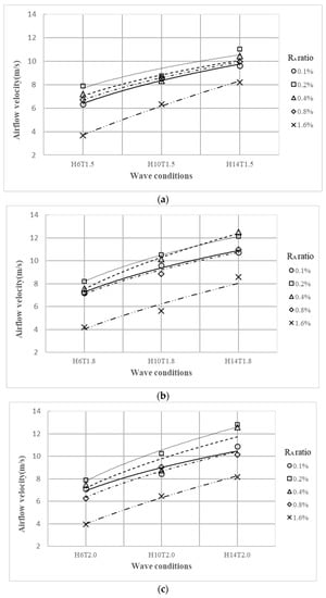 (a) Velocity of airflow for various wave heights (T = 1.5 s, RZ = 0.5); (b) Velocity of air flow for various wave heights (T = 1.8 s, RZ = 0.5); (c) Velocity of air flow for various wave heights (T = 2.0 s, RZ = 0.5).