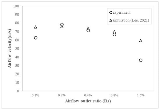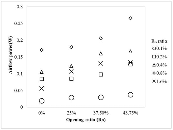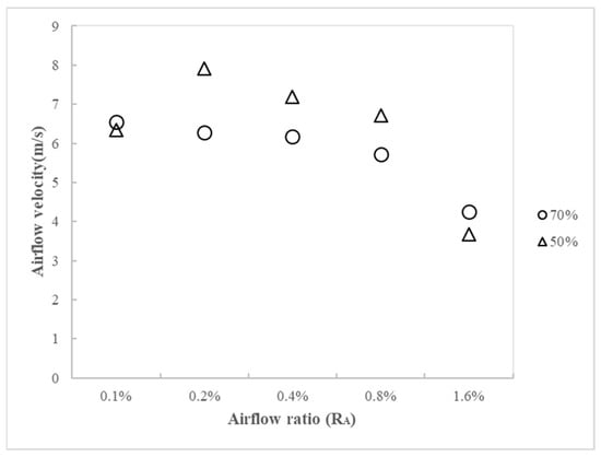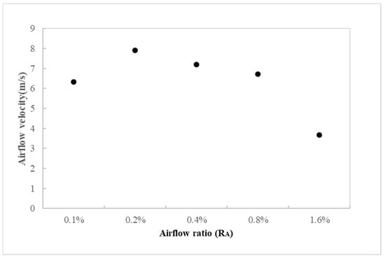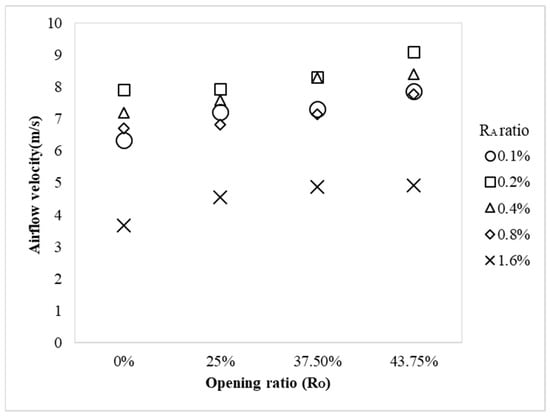 It is observed that, in correspondence with an increase in the opening ratio RA, the air flow velocity decreases non-linearly when it reaches the maximum velocity for the case RA = 0.2%. As indicated in the previous section, when the RA ratio reaches 1.6%, the velocity would drop significantly while, for the other opening ratios, the velocities may remain at rather high levels—between 6.3 m/s to 8.0 m/s.