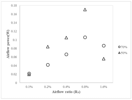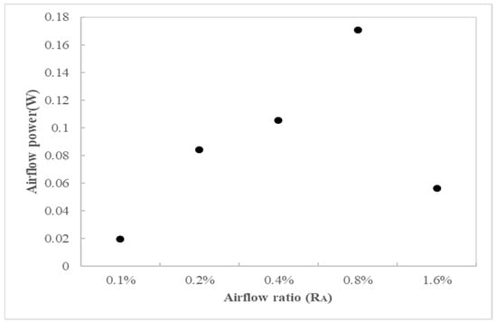 Presented in Figure 10 is the average of the pneumatic power corresponding to the various area ratios for the orifice of the OWC converter. It is observed that, in correspondence with an increase in the ratio of the orifice opening, the pneumatic power will increase until it reaches a peak value, where the RA = 0.8% and the pneumatic power is 0.17 W. It is also noticed that, even though the velocity of the case RA = 0.8% is not the largest, it has a larger cross-section for the orifice, which makes it have a larger volume of air flow that generates a larger amount of power.