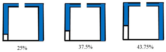 In order to capture more energy from the incident waves, according to the prevailing direction of waves, a gate in front of the chamber is added and expected to upgrade its energy conversion efficiency. However, if the wave direction changes and is not aligned with the opening gate, the converting efficiency is also studied for the case in which the RO ratio is 0. The opening of the OWC gate is set as a ratio of the gate-opening to the height of the chamber for the OWC converter, as indicated as O/Z = RO in Figure 6. The height of the chamber of the OWC converter is set at a constant 15 m, while the opening ratio of the gate is variable, as presented in Figure 11, and ranged between 25% to 43.75% for comparison.