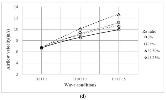 Presented in Figure 12a–d is the average of velocity of the air flow for various ratios of orifice RA, which varies from 0.1% to 0.8%, while the ratios of the gate opening of the OWC converter to chamber height RO are also varied. It is observed from Figure 12a–d that an increase in the wave height corresponds to increases in the air flow velocity, no matter what the orifice opening ratios are. Regarding the variation in the opening ratio RO of the air chamber gate, the air flow velocity seems to not be influenced much when the outlet orifice of the chamber is as small as RA = 0.1%, as shown in Figure 12a. However, for the other opening ratios of outlet orifice RA, as observed from Figure 12b–c, a clear separation in the velocity performance is found for the chambers with various opening ratios of the air chamber gate RO. The OWC with the larger opening ratios for the air chamber gate RO, such as RO = 37.5 % and 43.75%, have higher velocities in the cases where the RA ratio is 0.2% and 0.4%, as shown in Figure 12b,c. When the OWC chamber has a larger orifice for the outlet air, such as the ones with RA = 0.4% and 0.8%, a high velocity of air flow occurs for the case in which RO = 37.5%, as shown in Figure 12c,d.