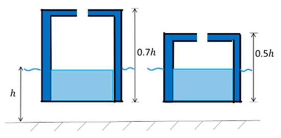 The submerged depth of the OWC may have an influence on the performance of an OWC converting system. Therefore, in this section a dimensionless ratio for the chamber height of the OWC converter compared to the water depth is taken into consideration, as indicated in Figure 6 and Figure 15. Two variations of the chamber height for the air chamber were determined. The dimensionless ratio for the chamber height of the OWC converter compared to the water depth is set as RZ = 70% and 50% when the water depth of the chamber is 70 cm.