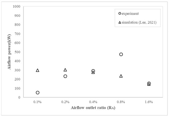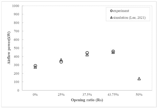 Figure 22 shows a comparison of the pneumatic powers between the experimental data and the analytical simulation, which corresponds with the variations in the opening ratio of the front gate and the height of the chamber. In the comparison, a good agreement between the experimental data and the analytical results is also generally observed. For the same reason as indicated previously, the experiment for the last ratio of the gate opening RO = 50% was not performed and only the simulation data is shown in the figure.