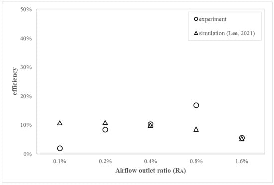 Presented in Figure 20 is the comparison of the converting efficiency of the air flow from the OWC system between the experimental results and the analytical simulations, which corresponds to the variations in the area ratio of the outlet orifice and the water surface inside the chamber. A pattern similar to the pneumatic power is shown, since the converting efficiency is a ratio of the pneumatic power to the energy of an incident wave. In order to find the influence of the dimensional ratios on the converting efficiency, the applied incident wave remains constant, and the input energy of the waves is also constant so that the converting efficiency has a similar pattern to the pneumatic power, which corresponds with the variation in the outlet orifice ratio.