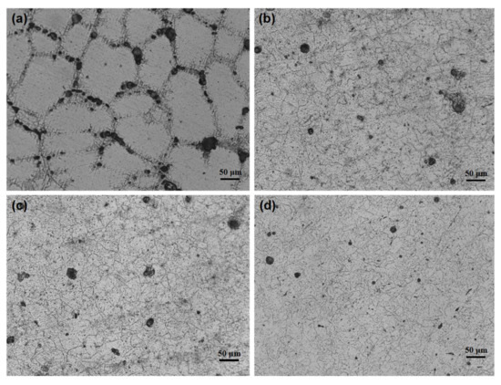 The microstructures of the Al-1Zn-0.1In-0.1Sn-0.5Mg-xMn (x = 0, 0.1, 0.2, 0.3) alloys are displayed in Figure 1. The crystal grain of x = 0 alloy is coarse and its average size is above 100 μm. The crystal grain is obviously refined after the addition of Mn (Figure 1b–d), in which the average size is about 10 μm. The reason for the grain refinement is that Mn and Al formed intermetallic MnAl6; in addition, the impurity of Fe decreased the solid solubility of Mn in Al and formed the (Mn, Fe)Al6 compound. The segregation of fine MnAl6 and (Mn, Fe)Al6 may hinder the grain growth by pinning the grain boundaries [29,31]. The refined grain can not only facilitate the homogeneous dissolution of the alloy, but also may change the distribution of the segregation phase.