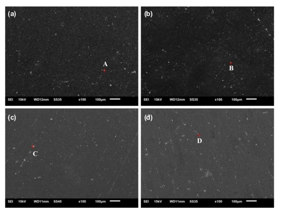 SEM images of the Al-1Zn-0.1In-0.1Sn-0.5Mg-xMn alloys: (a) x = 0, (b) x = 0.1, (c) x = 0.2, (d) x = 0.3.