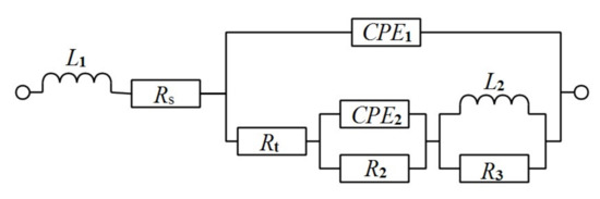 The EIS curves of the Al-1Zn-0.1In-0.1Sn-0.5Mg-xMn (x = 0, 0.1, 0.2, 0.3) alloy anodes in the 4 M NaOH solution are presented in Figure 4. Figure 5 shows the equivalent circuits for simulating the EIS curve. Among them, Rs represents the solution resistance. It has been reported that the induction loops in the EIS curves reflect the hydrogen adsorption process in the hydrogen evolution reaction caused by the corrosion of the alloy, and the L1 in the equivalent circuit corresponds to the hydrogen evolution reaction parameter [41]. In addition, the high frequency capacitance loops in the EIS curves reflect the charge transfer reaction that occurs in an electric double layer formed between the corrosive medium generated during the etching process and the surface of the alloy. Similarly, the equivalent components reflected in the equivalent circuit are the constant phase component (CPE1) and the parallel charge transfer resistor (Rt). Furthermore, the dissolution-deposition of In and Sn ions during the alloy corrosion process is reflected in the low frequency capacitive loops. The corresponding dissolution-deposition parameters are CPE2 and R2 in the equivalent circuit. The intergranular corrosion is reflected in the low-frequency induction loop, and L2, R3 are the corresponding parameters [42,43].