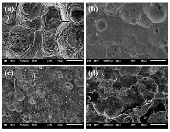 The surface morphologies of the Al-1Zn-0.1In-0.1Sn-0.5Mg-xMn (x = 0, 0.1, 0.2, 0.3) (wt.%) alloy anodes after discharging at 20 mA·cm−2 for 4 h in the 4 M NaOH solution; (a) x = 0, (b) x = 0.1, (c) x = 0.2, (d) x = 0.3.