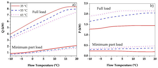 The main component for the consumer is the heat pump, which is not modelled as a physical cycle, but by means of real characteristic curves of an existing system by a German manufacturer [20]. This allows a significant reduction of the simulation time without affecting the overall results. The curves used in this approach can be found in Figure 1. The characteristic curves show the heat output at full load, as well as the minimum part load, for different temperature levels. A temperature of 35 °C was used for the provision of room heat, and 55 °C and 65 °C for the provision of domestic hot water. Figure 1b shows the corresponding electrical power consumption of the heat pump. From the imposed load and the brine temperature, the electrical power consumption of the heat pump and the coefficient of performance (COP) is calculated by Equation (7)