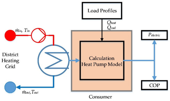 • Consumers: Each user is described by three thermal demand profiles for heating, cooling, and domestic hot water. Furthermore, the characteristic curves of the heat pump for each load case are implemented.