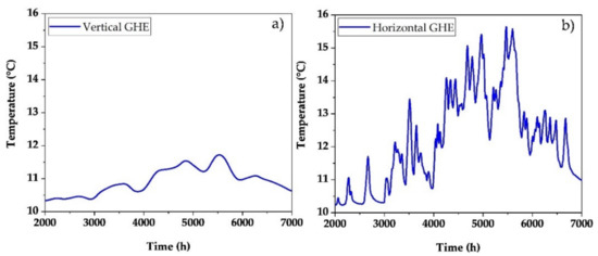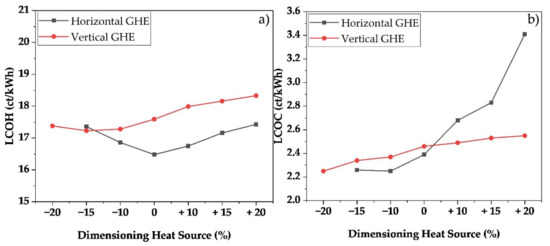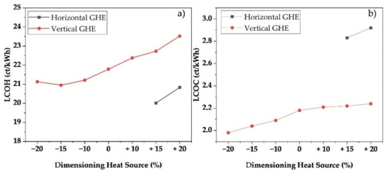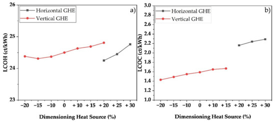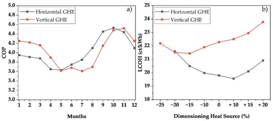 The overall COP values determined for the sole heating scenario with respect to both geothermal sources are shown in Figure 5a. It can be seen that borehole heat exchangers are advantageous in the cold season and collectors are advantageous in the summer. This is due to the pronounced weather dependency of the collector, which is more dependent on external influences. Therefore, it cools down more in winter than a comparable vertical GHE, but also heats up more in summer. The use of horizontal systems thus leads to a reduced electricity demand of the heat pumps, but increases the demand in winter. For this reason, vertical GHEs have a higher averaged COP over the year than comparable systems with a horizontal collector. However, the savings in electricity cannot compensate for the significantly higher investment costs. It can be found that the horizontal GHE is the more economical option in the design case. The calculated LCOH amounts to 19.8 ct/kWhth when using horizontal systems and 22.3 ct/kWhth in the case of a vertical systems. Accordingly, horizontal systems result in significant savings of around 12%.