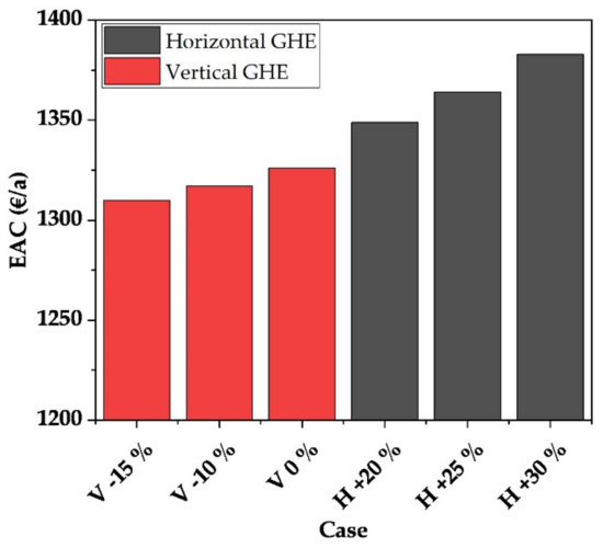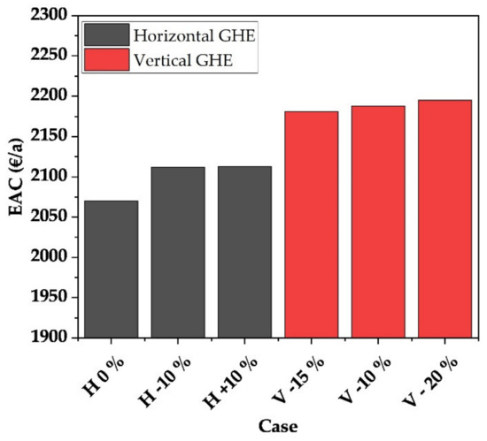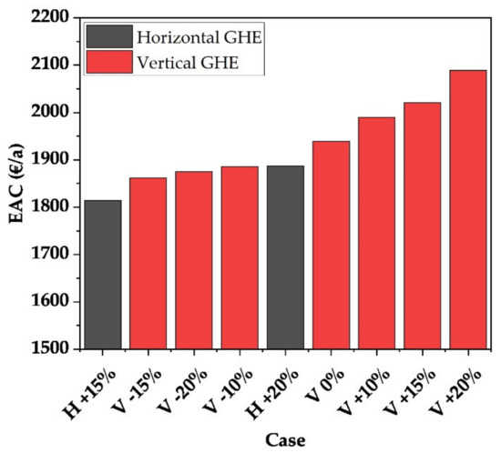 The economic analysis was based on the guideline VDI 2067 “Economic efficiency of building services systems” [37]. The economic feasibility was calculated in terms of equivalent annual cost (EAC), which represents the annual cost of owning, operating, and maintaining the system components. The EAC was calculated by Equation (10)