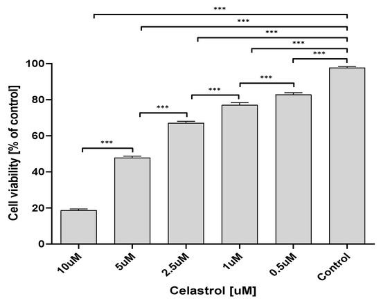 Trypan blue cell viability assay. The U251MG glioblastoma multiforme cells were treated with celastrol (0, 0.5, 1, 2.5, 5 and 10 μM). The data are presented as the means ± the SEM of six independent experiments. Statistically significant *** p < 0.001.