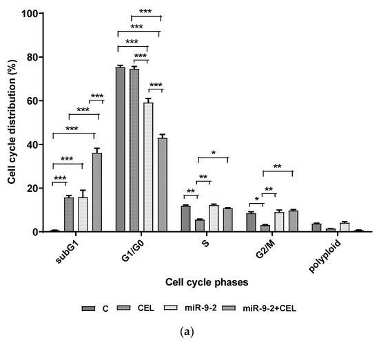 The cell cycle profiles of the U251MG cells that were examined using flow cytometry. (a) U251MG cells that had been exposed to celastrol (1 μM; CEL) for 24 h, the siRNA that is specific for miR-9-2 (0.25 nM; miR-9-2) for 48 h or a combination of the siRNA that is specific for miR-9-2 (0.25 nM) for 48 h and celastrol (1 μM) for 24 h (miR-9-2 + CEL). (b) The U251MG cells that had been exposed to celastrol (1 μM; CEL) for 24 h, the siRNA that is specific for miR-17 (0.25 nM; miR-17) for 48 h, or a combination of the siRNA that is specific for miR-17 (0.25 nM) for 48 h and celastrol (1 μM) for 24 h (miR-17 + CEL). (c) The U251MG cells that had been exposed to celastrol (1 μM; CEL) for 24 h, the siRNA that is specific for miR-19 (0.25 nM; miR-19) for 48 h or a combination of the siRNA that is specific for miR-19 (0.25 nM) for 48 h and celastrol (1 μM) for 24 h (miR-19 + CEL). The results are presented as the percentage contribution of the number of cells that were located in each cell cycle phase, including the subG1 population. The results represent the average of three replicates. Statistically significant * p < 0.05, ** p < 0.01, *** p < 0.001.