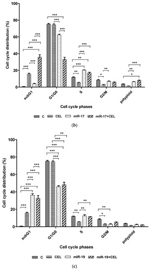 It was found that the siRNA that is specific for miR-17 in combination with celastrol and the siRNA that is specific for miR-19 without and in combination with celastrol increased the percentage of the cells in the subG1 phase most intensively compared to the untransfected (control) cells and the U251MG cells that had only been exposed to celastrol (35.87%, 36.23%, 32.7% vs. 0.67%, respectively). Additionally, the siRNA that is specific for miR-17 and miR-19 in combination with celastrol decreased the percentage of the cells in the G1/G0 phase compared to the above-mentioned cell groups of the glioblastoma multiforme U251MG cells (62.37%, 46.03% vs. 75.3%, respectively). Moreover, the siRNA that is specific for miR-17 without and in combination with celastrol significantly increased the percentage of cells in the S compared to the untransfected (control) cells (20.3%, 17.03%, vs. 11.87%, respectively) (Figure 2b). We also revealed that the siRNA that is specific for miR-17 and miR-19 without and in combination with celastrol and celastrol alone significantly decreased the percentage of cells in the G2/M phase (6.9%, 5.93%, 2.83%, 5.25% and 3.78% vs. 11.87%, respectively) (Figure 2b,c). We also revealed that the siRNA that is specific for miR-19 most strongly decreased the percentage of cells in the G2/M phase compared to the other studied groups (Figure 2b,c). This phenomenon was not observed in the case of the miR9-2-silenced cells (Figure 2b,c). We also revealed that the miR-17 that is specific for siRNA without and in combination with 1 μM celastrol increased the polyploidy of the U252MG cells (Figure 2b).