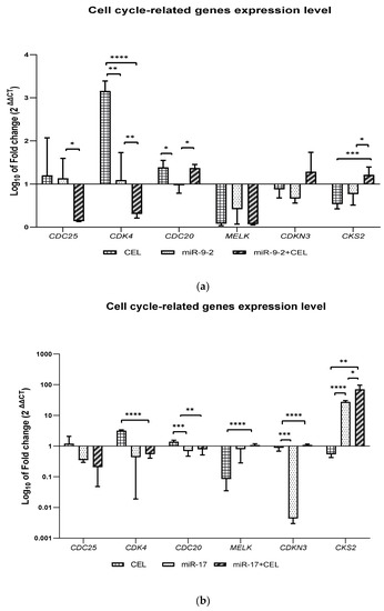 We found that the changes in the cell cycle-related genes after the miR-17 knockdown were mainly manifested in a decreased CDC25A, CDK4 and CDKN3 (comparable to combining with the miR-17 gene silencing and celastrol exposure) gene expression and an increased CKS2 gene expression (comparable with the combination with celastrol). The knockdown of the miR-17 gene in combination with celastrol increased the CKS2 gene expression more strongly than just silencing the miR-17. Only the knockdown of the miR-17 gene decreased the expression of the CDKN3 gene (Figure 3b; Table 2)