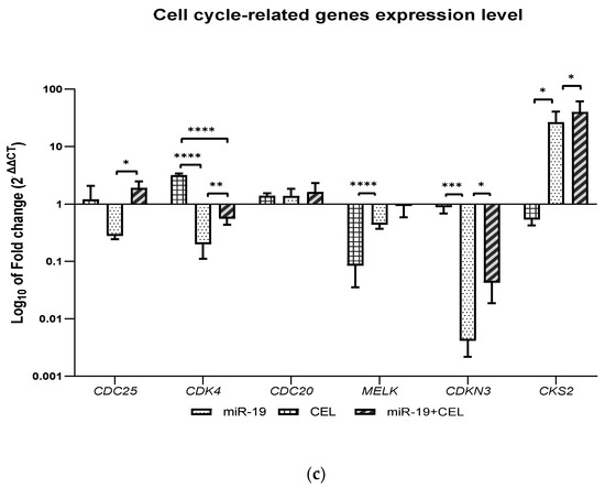 We also revealed that the changes in cell cycle-related genes after the miR-19 knockdown were mainly manifested in a decreased CDC25A, CDK4, MELK and CDKN3 gene expression. Celastrol significantly increased the CDC20 gene expression (comparable to a combination of the miR-19 silencing with celastrol). The knockdown of the miR-19 gene in combination with celastrol increased the CKS2 gene expression more strongly than just silencing the miR-17 and increased the CDC25A gene expression (Figure 3c; Table 2).