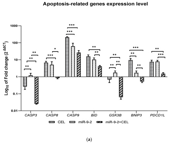 We found that the changes in the apoptosis-related genes after the miR-9-2 knockdown were mainly manifested in an increased CASP8, CASP9, BID, GSK3B, BNIP3 and PDCD1L gene expression. In turn, celastrol increased the expression of all of the genes mentioned above except GSK3B. The knockdown of the miR-9-2 gene in combination with the exposure to celastrol increased CASP9, BID and PDCD1L decreased (antagonistically to celastrol) BNIP3 and decreased GSK3B (antagonistically to the miR-9-2 silencing only) gene expression (Figure 4a; Table 4).