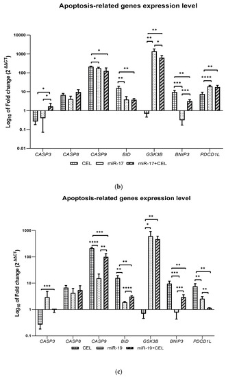 We also revealed that the changes in the apoptosis-related genes after the miR-19 knockdown were mainly manifested in an increased CASP3, CASP8, CASP9, BID, GSK3B and PDCD1L gene expression. The knockdown of the miR-19 gene in combination with celastrol increased PDCD1L gene expression more strongly than just silencing the miR-19 (Figure 4c; Table 4).