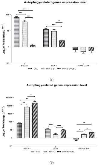 It has been shown that silencing the miR-9-2 gene and the combination of the knockdown of this gene with exposure to celastrol increases the expression of the BECN1 and ULK1 genes. Moreover, it was found that silencing the miR-17 and miR-19 genes in cells that had either been exposed or not exposed to celastrol not only increased the expression of the BECN1 and ULK1 genes, but also that of the MAPLC3IIA gene.