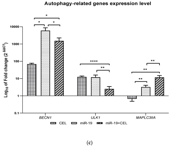We found that the changes in the autophagy-related genes after the miR-9-2 knockdown as well as after the exposure of the U251MG cells to celastrol were mainly manifested in an increased BECN1 and ULK1 gene expression (Figure 5a; Table 6). The knockdown of the miR-17 and miR-19 genes without and in combination with exposure to celastrol increased the BECN1, ULK1 and MAPLC3IIA gene expression (Figure 5b,c; Table 6).