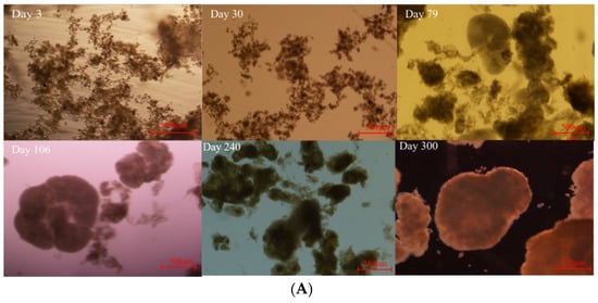 3.1. Characteristics of Aerobic Granular Sludge during Long-Term Operation
