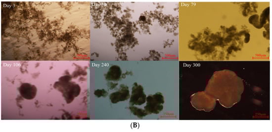The biomass concentration, indicated by MLVSS/MLSS over the whole operation time, is shown in Figure 4C,D, which depicts the growth and accumulation of aerobic granules as a whole. MLSS in the two reactors initially decreased, stagnated at the lowest concentration after the granules had formed for a period of time, and increased again by the end of the operation. In R1, the MLSS gradually decreased from 5.6 g/L of inoculum to 0.7 g/L on day 58, which was caused by the washout of the flocs due to the increased SVI and the shortened settling time. After this low MLSS was maintained for about 7 days, aerobic granules began to form and MLSS began to increase due to retention and growth of high-settling biomass. In R2, the only difference in MLSS development from R1 was that the low biomass period (0.69 g/L) lasted longer, approximately 40 days. This was due to the longer sludge bulking and SVI30 fluctuating twice in R2, resulting in less biomass retention than in R1. After aerobic granules formed in R2 on day 90, MLSS began to increase. After the aerobic granules were formed in both reactors, the MLSS gradually increased to 6.8 g/L in R1 and 5.1 g/L in R2 at the end of the operation.