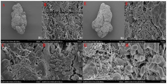 SEM of the aerobic granules in R1 and R2. (A–D), in R1; (E–H), in R2.