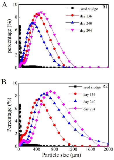 The size of aerobic granules throughout the whole operation is shown in Figure 3, which reveals a different development of granules in R1 and R2. The mean size of the aerobic granules in R1 increased with a large fluctuation, while that in R2 increased stably, until the end of the operation. In R1, the mean size of aerobic granules increased to 380 µm on day 136, while it decreased to 276 µm on day 240, which was combined with variations in the settling ability of aerobic granules. On day 294, the size appeared to recover and increased to 462 µm. In R2, the mean size of aerobic granules gradually increased to 662 µm on day 294. Meanwhile, the size distribution of aerobic granules was found to be highly variable, with a narrower size distribution in R1 than in R2. These discrepancies in the size development and morphometry of the sludge in R1 and R2 over time indicate that the formation and growth of aerobic granules are different even under seemingly identical operating conditions, suggesting some degree of randomness unrelated to the apparent operating conditions related to granule formation and development. In addition, it should be noted that the mean size of the aerobic granules in the two reactors was less than 700 µm, implying that the overall mass transfer resistance in the granules may be negligible.