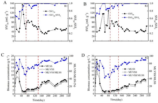 Profiles of SVI and MLSS during the operation period. (A,C), in R1; (B,D), in R2.