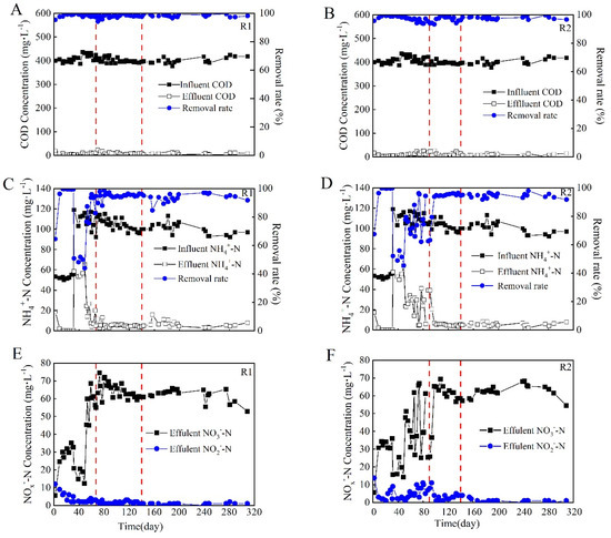 Performance of the aerobic granules over the operation period in R1 and R2. (A,B), COD removal in R1 and R2, respectively; (C,D), ammonium removal in R1 and R2, respectively; (E,F), NOX formation in R1 and R2, respectively.