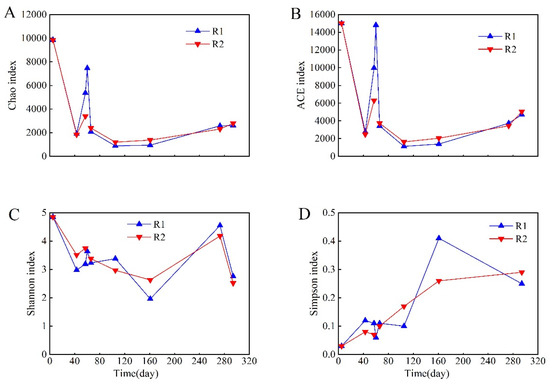 Richness and diversity indices of microbial populations in sewage sludge over the entire operating period in R1 and R2. (A) Chao1; (B) ACE; (C) Shannon; (D) Simpson.