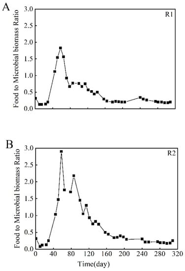 Food-to-Microbial Biomass Ratio in the whole operation period. (A) R1; (B) R2.