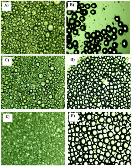 In Figure 1, it can be seen that the batch experiments for all the PEGs used (Figure 1A,C,E) resulted in emulsions in which the presence of very small and large droplets is visible and droplets that do not have a regular circular shape are present. In the case of the continuous experiment, the resulting emulsions contained larger spherical particles with similar diameters, with very few small droplets (Figure 1B,D,F).