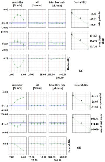 Optimization was performed for the zeta potential and for the average Feret diameter based on the desirability profiles obtained from the RSM predictions. The desirability scale ranging from 0 (undesirable) to 1 (very desirable) was used. The results are shown in Figure 2 and Figure 3.