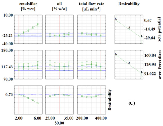 In continuous experiments, for PEG1500 emulsions, the optimal conditions were: emulsifier concentration of 2%, oil phase fraction of 35% and total flow rate of 350 μL/min, with the corresponding values at optimal conditions of ζ = −53.52 mV and d = 92.85 μm (Figure 3A). For PEG6000 emulsions, the optimal conditions for zeta potential were: emulsifier concentration of 2%, oil phase fraction of 27.5% and total flow rate of 300 μL min−1, with the corresponding values at optimal conditions of ζ = −34.72 mV and d = 117.27 μm (Figure 3B). For PEG20000 emulsions, the optimal conditions were: emulsifier concentration of 2%, oil phase fraction of 30% and total flow rate of 400 μL/min, with the corresponding values at optimal conditions of ζ = −25.21 mV and d = 117.43 μm (Figure 3C). It is interesting to note that in continuous experiments, the lowest emulsifier concentration is the one that gives the best results in all three cases, which is feasible because it allows the use of fewer chemicals (emulsifier in this case). As already described in the literature [29,30,31], many variables need to be investigated to obtain emulsions with desired properties, which is costly and time-consuming, so it is recommended to use numerical methods such as RSM for process optimization. For example, Caporaso et al. [32] applied RSM to optimize olive oil-in-water emulsification, Ahn et al. [33] used RSM to optimize microencapsulation of tomato extract by water-in-oil-in-water emulsification, Fathordoobady et al. [34] optimized microfluidic emulsification of hemp seed oil for oral delivery applications, and Nieves et al. [35] optimized ultrasound-assisted emulsion preparation in a microfluidic chip.
