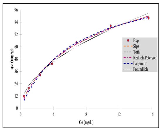 A modification of the Langmuir equation was proposed by Toth (1971) [52] and comprised a linear Ce-dependent term in the numerator in the Langmuir format, with an exponential term in the denominator as per the Freundlich expression. The Toth model can be represented by Equation (13):