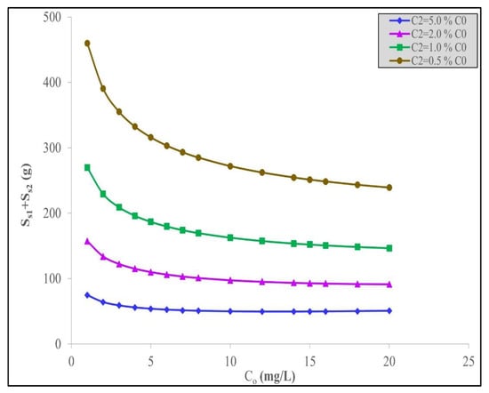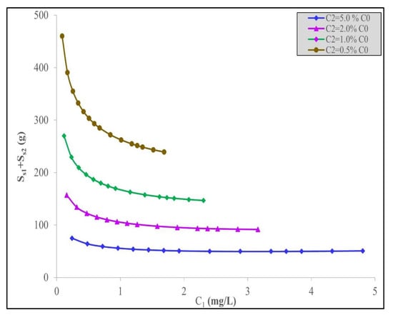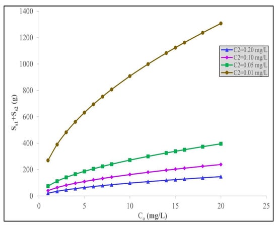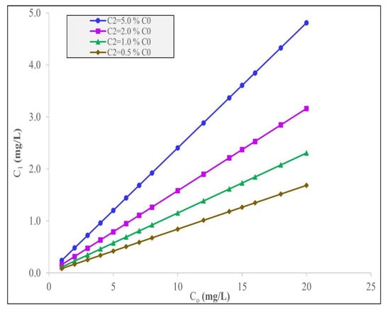 In Table 8, the effect of a lower effluent discharge concentration has a major impact on the additional amount of adsorbent required in the case of the single stage-batch adsorption process; that is, at a discharge limit concentration of 0.005 mg/L, 43.3 kg of adsorbent is required, which is 9.4 times the quantity required for the optimized two-stage system. In Table 8, the influence of the initial concentration is demonstrated and shows that the higher the initial IBU concentration is, the greater the extra amount of carbon is: 6.1 times more at C0 = 20 mg/L and Ce = 0.20 mg/L and only 1.8 times the amount of additional carbon at C0 = 1.0 mg/L and Ce = 0.20 mg/L.
