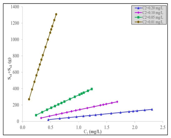 The subscripts “exp” and “iso” represent the experimental and calculated adsorbed capacity values, respectively. The results of the SSE analysis demonstrated that the SIPS, that is the Langmuir–Freundlich isotherm, describes the experimental data extremely accurately. Consequently, the Langmuir–Freundlich model is the preferred equation for application in the adsorbent minimization model presented in Section 4.3.
