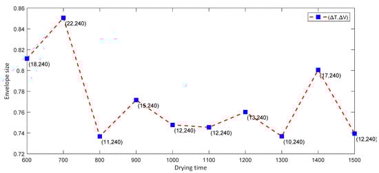 For each fixed value of the drying time, we applied the methodology shown in Section 2 to find an optimal operating envelope. We were then able to explore the design sensitivity by varying the value of the drying time to find a suitable design that consumes less time and energy but has a bigger operational envelope. The selected design would be the one that consumes less energy and has more flexibility.