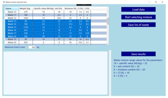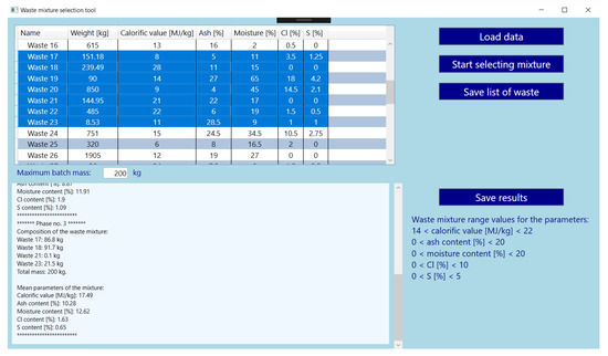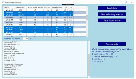 The assumption of the developed application for the selection of components of the waste mixture is to use it in real facilities—incineration plants. In order to be able to consider testing an actual installation, the application must be tested and properly prepared. The first aspect is to fulfill the main purpose of the tool, namely the selection of waste and their masses for the mixture constituting the portions of the input material in accordance with the adopted assumptions. These assumptions relate to obtaining a mixture with stable parameters, which can be defined as the basic fuel properties. The selection should ensure the optimal composition of the mixture, which will translate into effective energy recovery, saving conventional fuels and minimizing problems related to emissions from the thermal process.