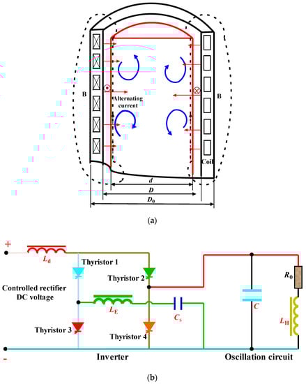 An intermediate-frequency furnace with an inverter circuit of hybrid power supply is showed in Figure 1. As shown in Figure 1a, the material with diameter d is heated due to electromagnetic induction after it is put into the inductor (with inner diameter D and outer diameter D0) and then the two ends of the inductor are connected with an alternating current with frequency f.