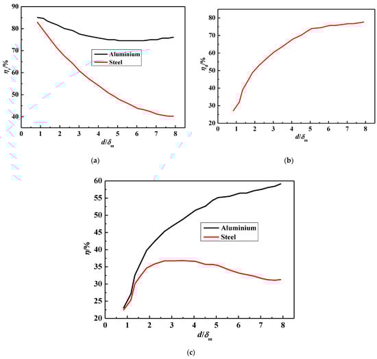 As shown in Figure 3, there is a close relationship between electrothermal efficiency and the ratio of d/δm (δm is the current penetration depth). The ratio increase of d/δm will increase the electrical efficiency and decrease the thermal efficiency. When d/δm < 5, the electric efficiency will change greatly, and the change is not obvious later.