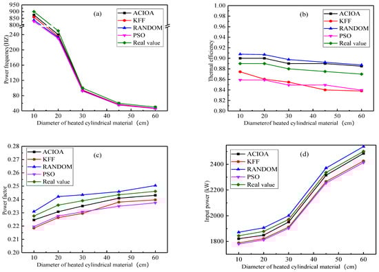 In this paper, the ACIOA was used to optimize the medium-frequency induction furnace. The results of optimization and non-optimization are shown in Table 2, respectively. In general, the active power, total heat loss power, and excessive clearance reactive power ere the main reasons for the decrease in power factor and thermal effective of the induction furnace. It can be seen that the system power factor and thermal effective of the induction furnace in the frequency domain were better than before. When the diameter of heated cylindrical material was 103 mm and the power frequency, the power factor and thermal effective were greatly improved. For instance, the power factor increased from 0.156 to 0.400, and thermal effective increased from 54.7% to 77.2%.