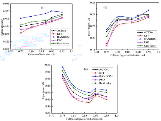 The effect of the fullness degree of the induction coil on circuit performance parameters was shown in Figure 7. It showed that the thermal efficiency increased with the increase in the fullness degree of the induction coil. In addition, with the increase in fullness degree of the induction coil, the power factor firstly increases, then decreases, and finally increases. The greater the fullness of the inductor, the smaller the clearance between turns. Thus, greater fullness of the inductor can reduce the power loss and improve the thermal efficiency. With the increase in fullness of the induction coil, the increasing trend of the power factor gradually slows down. In the design process, the fullness of the inductor should be as large as possible, in order to reduce the clearance between turns. In addition, the analysis shows that the improved model can better predict the operating parameters of the medium-frequency induction furnace.