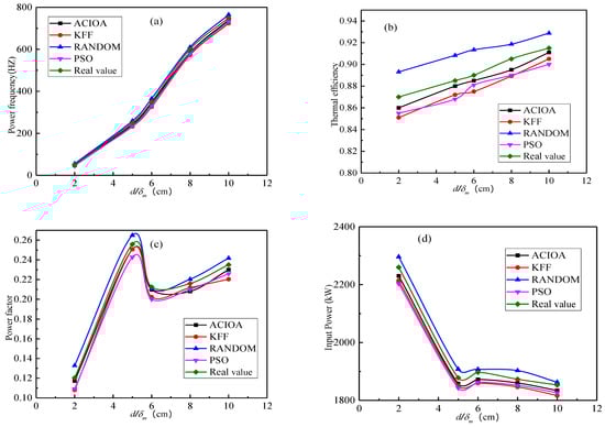 The effect of the ratio of diameter to current penetration depth on circuit performance parameters is shown in Figure 8. It shows that the power frequency and thermal efficiency increased with the increase in the ratio of diameter to current penetration depth. The input power firstly decreases, then increases, and finally decreases with the increase in the ratio of diameter to current penetration depth. It can be seen that it is very important to choose the appropriate ratio of diameter to current penetration depth. If the penetration depth is too small, the heating time becomes longer and the heat loss increases, which seriously reduces the thermal efficiency and power factor. When the problem becomes more serious, it may even happen that the temperature does not change in the heating process. However, when the penetration depth is too large, the thermal efficiency reduces markedly and the electric efficiency increases slightly. Thus, the thermal efficiency can be improved by increasing power frequency. The increase in power frequency will lead to an increase in production cost. Generally, the suitable ratio of diameter to current penetration depth is between 3.5 and 6.0. Similarly, the analysis shows that the improved model can better predict the operating parameters of the medium-frequency induction furnace. Dou et al. [] have similar conclusions.