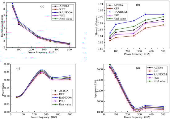 The effect of power frequency on circuit performance parameters is shown in Figure 9. It shows that the current penetration depth decreased with the increase in power frequency, and the thermal efficiency increased with the increase in power frequency. It can be seen that high power frequency is beneficial to the improvements in power factor and thermal efficiency. If the power frequency is too high, it will reduce the power factor and increase the production cost. Thus, a suitable power frequency can effectively improve the power factor and reduce the required power. In the design process, the suitable power frequency should be considered. Only in this way can we save resources and improve efficiency. In addition, the analysis also shows that the improved model can better predict the operating parameters of the medium-frequency induction furnace.
